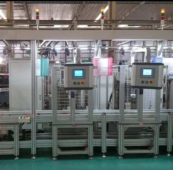 右后轴盘毂总成的共线装配。装配线配置有自动拧紧机